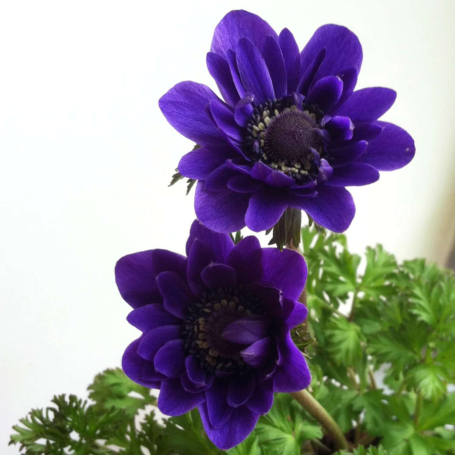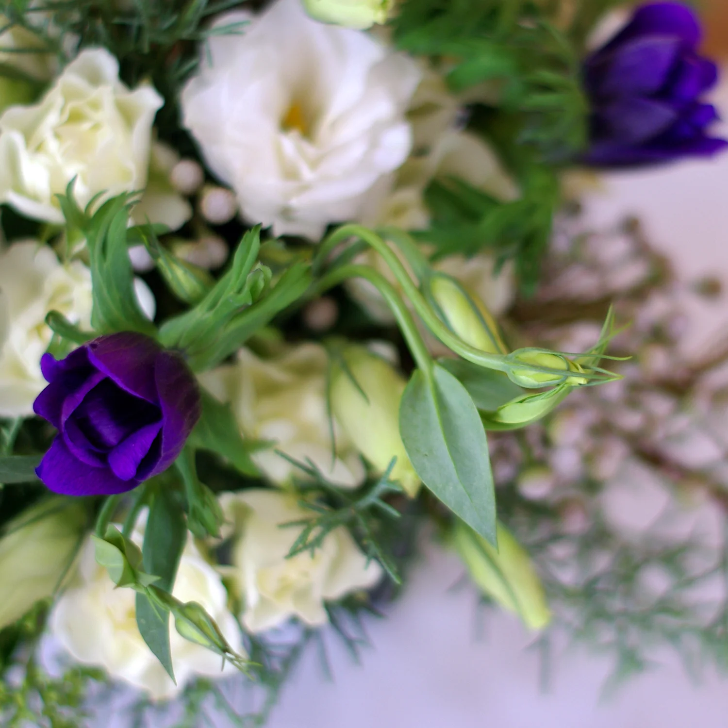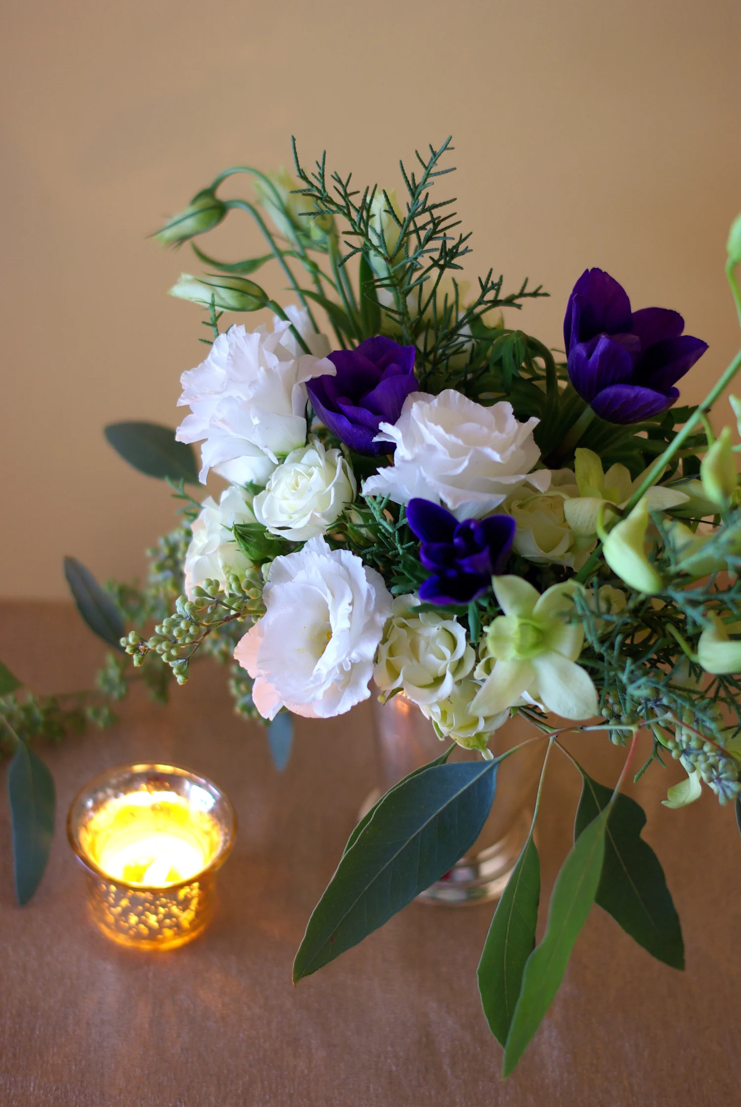 Two different parties this week but in the same joyous vein: one a baby shower and the other a birthday. It has been such a dark November that it was a relief to use a bright white and purple palette. Most of the flowers and foliage used in these arrangements come from British Columbia, including the purple anemones which slowly open their velvet petals in the sun. True winter jewels, they're worthy of any celebration!