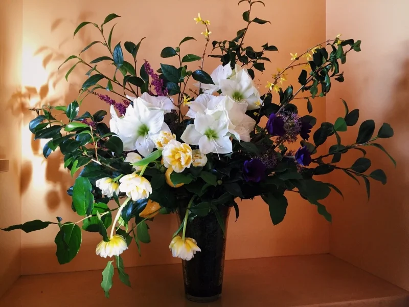It's always nice to be asked to do whatever you want! But in return it means my client gets a unique mix of flowers, some of which may only be available that week on the market. I had originally envisioned a darker, dramatic palette for some arrangements to decorate a stage at the Shaw Conference Centre. However, by the time January hit, I think everyone in Edmonton was craving something bright and springy. Forsythia was available for the first time this year and I took my cues from it - pairing it with some gorgeous 'Flaming Evita' tulips, lemons and white amaryllis to bring a pop that could be seen from the back of the hall.